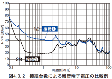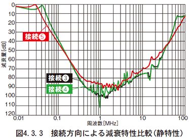 図4.3.3に、接続方向によるノイズフィルタの減衰特性(静特性)の比較を示します。また、図4.3.4には接続方向による実際のノイズ特性を示します。