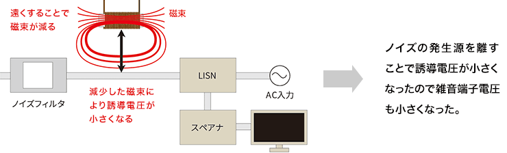 ノイズ発生源であるスイッチング電源と配線の距離を離すことで、磁束による干渉が減り、誘導電圧も小さくなりました。結果として、余分な雑音端子電圧が低減されました。