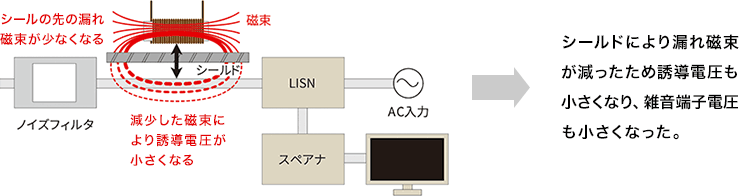 電源内部から外部へ漏れる磁束をケースカバーで遮蔽し、磁束漏れを大幅に低減。その結果、誘導電圧が抑えられ、雑音端子電圧も低減できました。