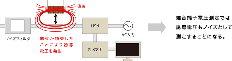 本事例では、チョークコイルからの磁束が配線に干渉し、鎖交によって誘導電圧が発生。その余分な誘導電圧が、ノイズ測定結果を悪化させていました。これが、ノイズフィルタの期待効果が得られなかった主な要因です。
