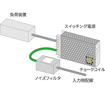 スイッチング電源内部にあるチョークコイルから発生する磁束が、近くを通るノイズフィルタの入力側配線に干渉すると、ノイズフィルタが本来持つ減衰効果が十分に得られない場合があります。
