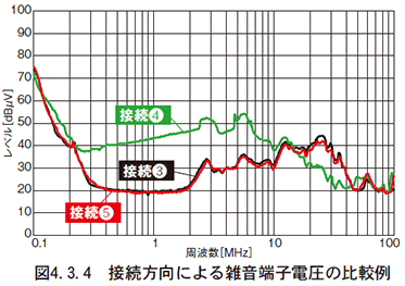 図4.3.3に、接続方向によるノイズフィルタの減衰特性(静特性)の比較を示します。また、図4.3.4には接続方向による実際のノイズ特性を示します。