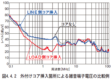LINE側にコアを追加する場合、ノイズフィルタ内部のチョークコイルに対し十分に大きな値のインダクタンスが得られるコアが必要になります。LINE側に内部チョークコイルのインダクタンス値と同等性能以下のコアをただ入れるだけでは、ノイズ低減に大きな効果は得られません。