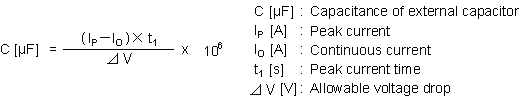 The peak current can be supplied if an external capacitor is installed. The required capacitance of the external capacitor can be calculated using the following formula: