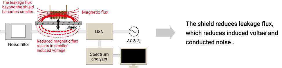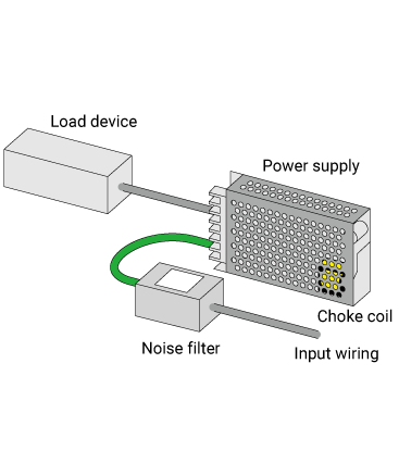 Magnetic flux generated from the choke coil inside a switching power supply can couple into the input wiring of a nearby noise filter. When this occurs, the noise filter cannot provide its intended attenuation performance.