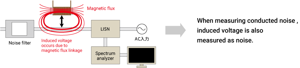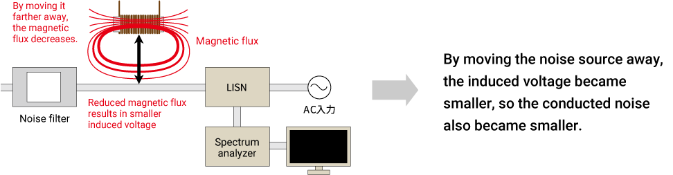In this case, magnetic flux emitted from the choke coil coupled with the wiring, inducing unwanted voltage through magnetic linkage. This additional induced voltage caused the noise measurement results to worsen, preventing the noise filter from delivering its expected performance.