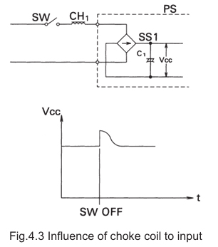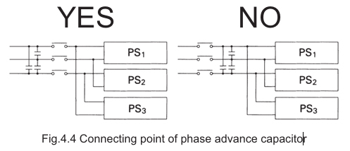 In three-phase AC systems, power-factor correction capacitors are used to compensate for current phase lag. However, if a power-factor correction capacitor is installed downstream of the input switch, the voltage stored in the capacitor when the switch is turned OFF may remain. When the switch is subsequently turned ON, this residual voltage can be superimposed on the input voltage, resulting in an excessive voltage. This may cause severe damage to the power supply. Therefore, installing a power-factor correction capacitor after the input switch must be strictly avoided.
