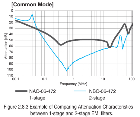 The following graph shows a comparison of the attenuation characteristics of one-stage and two-stage EMI filters.