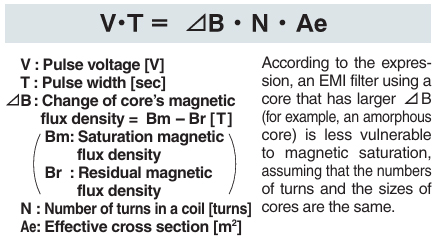 When the volt-second product of a pulse exceeds a certain threshold, the choke coil inside the EMI filter becomes magnetically saturated, causing its noise‑suppression ability to drop significantly.