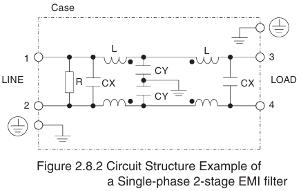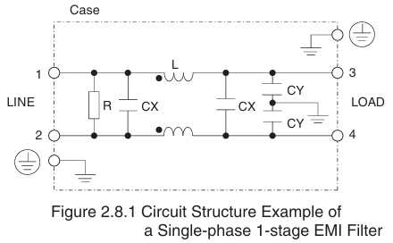 This figure shows a typical circuit configuration for single-phase EMI filters.