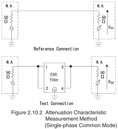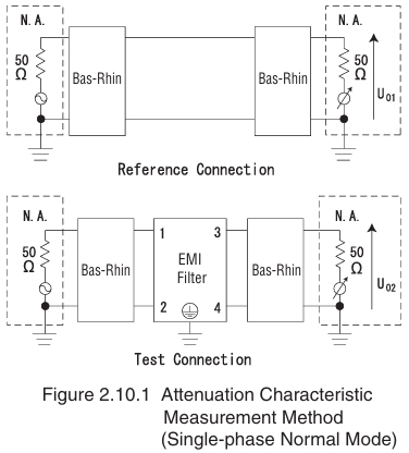 The measurement methods are shown in Figures 2.10.1 and 2.10.2. Attenuation is defined as the ratio of U01 to U02, where U01 is the output when the EMI filter is not inserted in the circuit, and U02 is the output when it is inserted. This ratio is normally expressed in decibels [dB] using its logarithmic value.