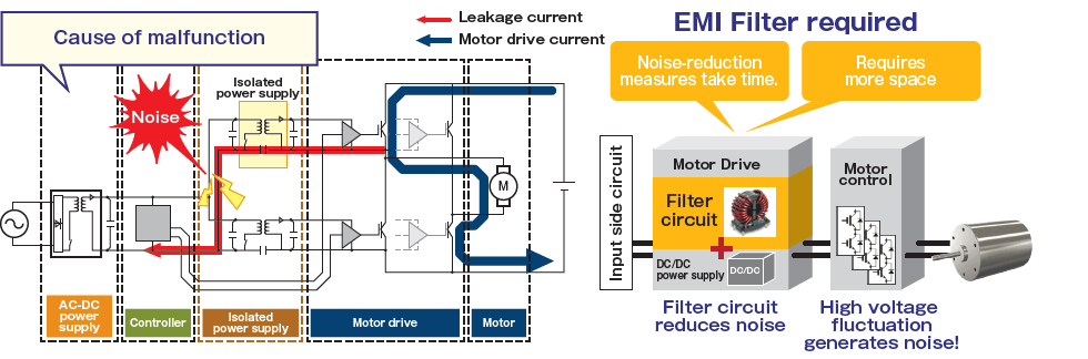 Noise current through the coupling capacitance of the isolated power supply must be suppressed.