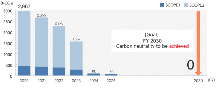 COSEL initially set a target within Japan to reduce CO2 emissions to 30% or less of FY 2020 levels by FY 2030. To accelerate these efforts, we have revised this target and are now working toward achieving carbon neutrality by FY 2030.