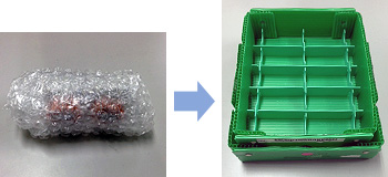 Previously, we had used bubble wrap bags to send certain components to our OEM manufacturers. After unpacking, these were disposed of as industrial waste. We were able to reduce the amount of waste by adopting a new packing method using reusable returnable containers. We also improved the reusability of these containers through means that include the use of rubber bands to keep their lids in place.