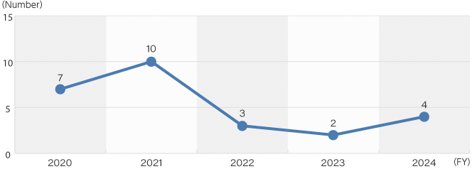 Unfortunately, the number of industrial accidents shifted to an increasing trend in FY 2024. No general trends were apparent in the details of the accidents. We responded by implementing preventive measures individually, publicizing and raising awareness of the accidents across the organization, and making additions to health and safety educational materials.