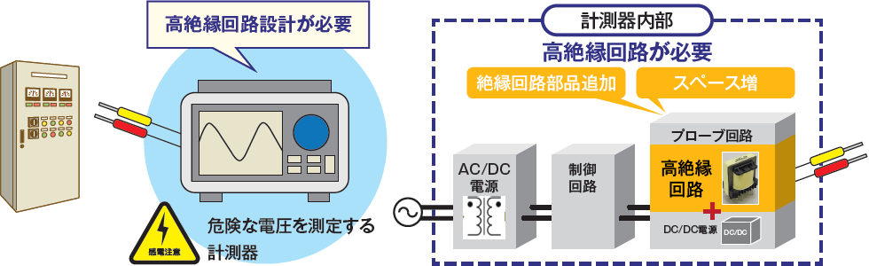 分電盤などの危険な電圧を取り扱う回路を測定する計測器には、感電に対する安全確保のため高絶縁が必要。