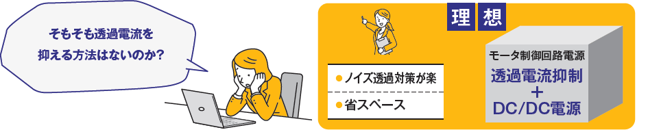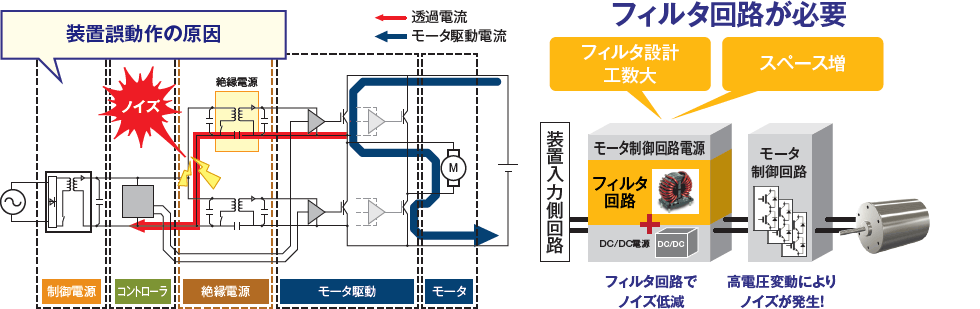 絶縁電源の入力-出力相間容量を介した透過電流ノイズの抑制が必要。