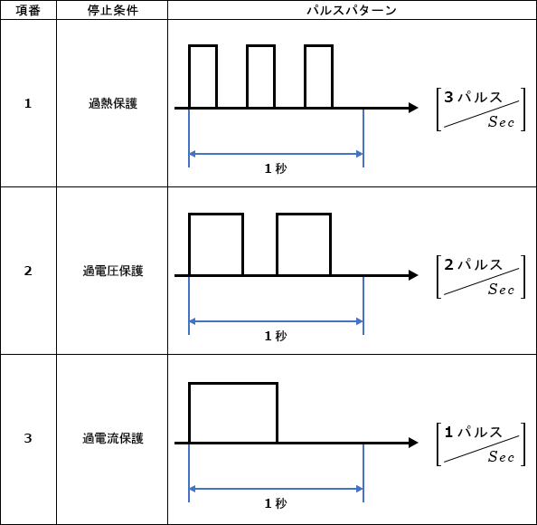 アラーム信号のパターン化によって、どんな異常(条件)で電源の出力が停止したか判別することが可能です。
