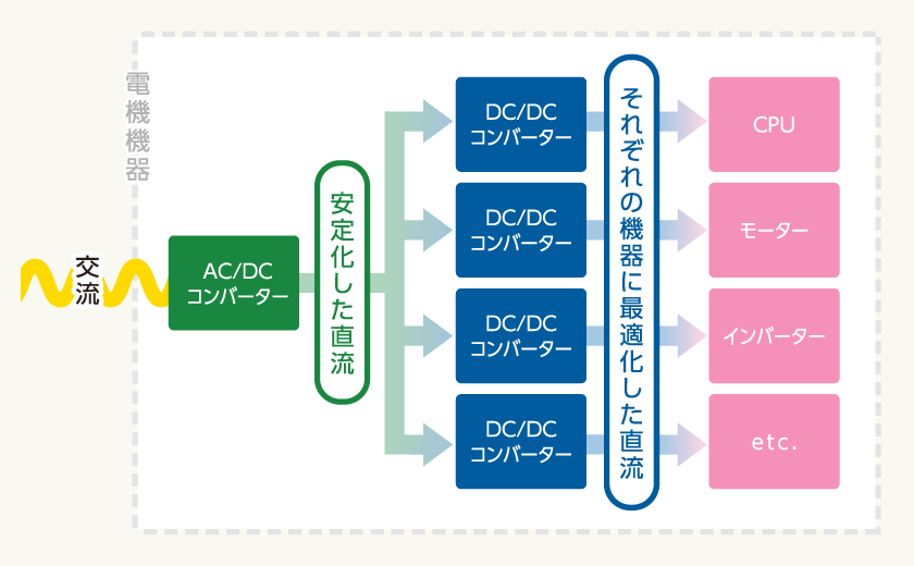 また電気機器の中のICやモーターなどのデバイスを正しく動作させるためには、それぞれのデバイスごとに最適化した直流を供給しなくてはなりません。