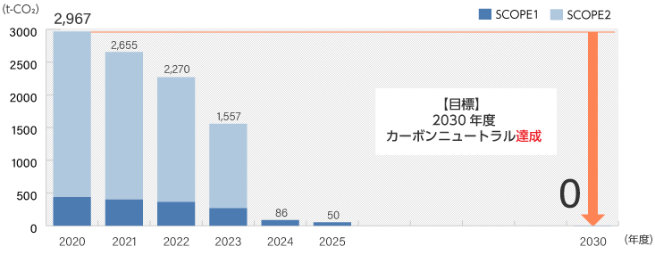 コーセルは、CO2 排出量(国内)を『2020年度比で2030年度:30%以下』という目標を掲げていましたが、取り組みを加速させ、目標を前倒しし、「2030年度にカーボンニュートラル達成」に向けて取り組んでいます。